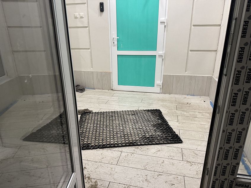 Во избежание травм на плитку постелили противоскользящий коврик, однако такое решение проблемы нельзя назвать оптимальным. Коврик закрывает лишь часть пола и сам становится препятствием для посетителей, особенно для малышей.