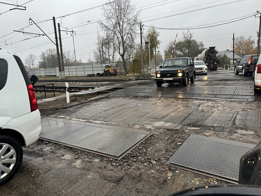 На железнодорожном переезде в Снегирях в рамках ремонтных работ снято асфальтовое покрытие, в связи с чем скорость движения автотранспорта практически равняется нулю.