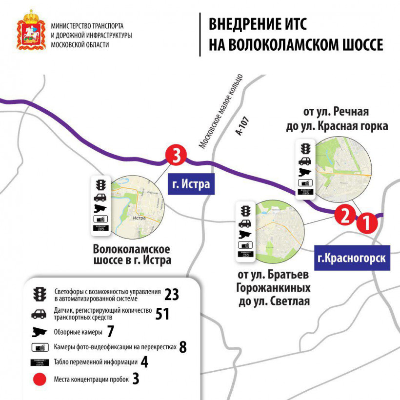 «В 2019 году будет реализован пилотный проект интеллектуальной транспортной системы «Умная дорога» на Волоколамском шоссе. Внедрение ИТС на Волоколамском шоссе проведут по поручению губернатора Московской области Андрея Воробьёва в рамках национального проекта «Безопасные и качественные автомобильные дороги», согласно которому необходимо уменьшить число пробок в городах и увеличить пропускную способность дорог, — сообщил министр транспорта и дорожной инфраструктуры Московской области Алексей Гержик. — После открытия эстакады на пересечении Ильинского и Волоколамского шоссе, пробки переместились в г. Красногорск, в том числе из-за отсутствия координированного управления светофорами. Пробки во многих местах возможно уменьшить с помощью управления транспортными потоками.