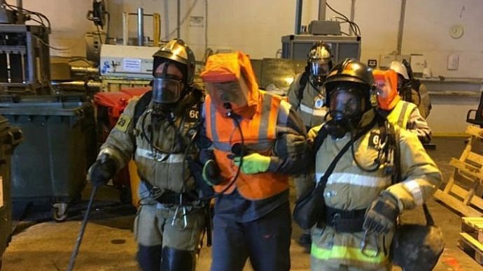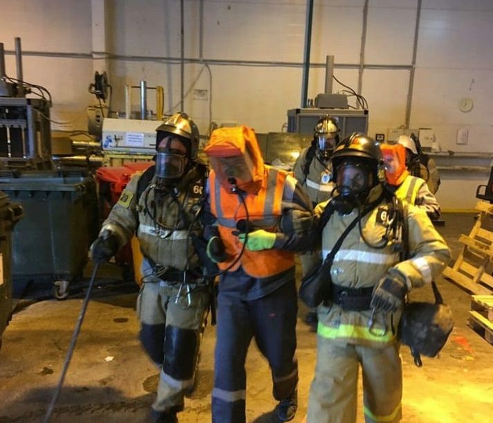 По сценарию в складской зоне главного корпуса сработала автоматическая пожарная сигнализация. Проведена эвакуация сотрудников завода. Прибывшие пожарные подразделения произвели ликвидацию условного пожара, а также условно спасли двоих пострадавших с последующей передачей медицинскому работнику завода.