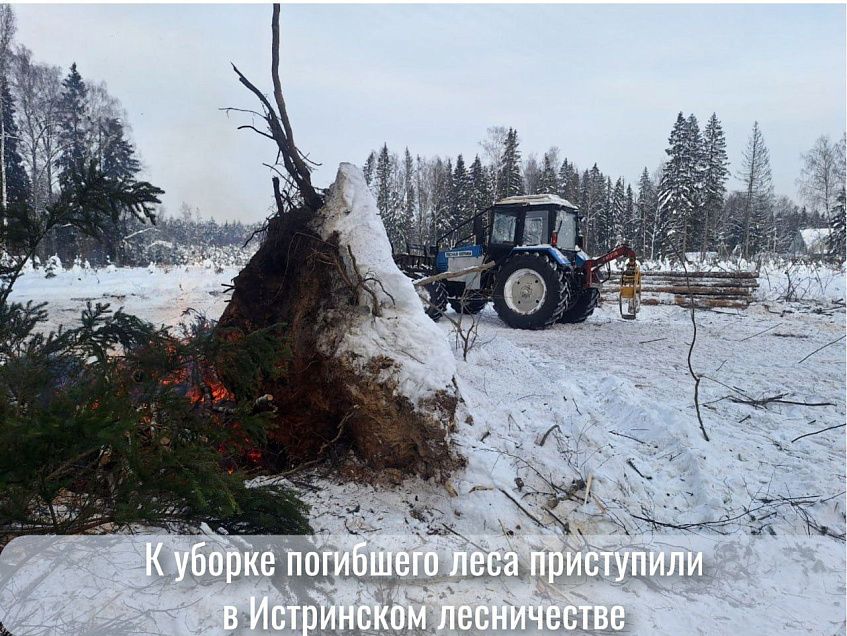 Специалисты Истринского филиала «Мособллес» проводят уборку погибшего леса вблизи Андреевского