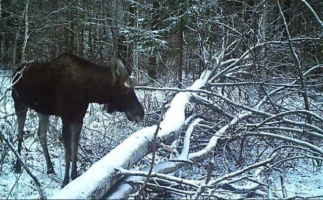 Четыре особи стояли у обочины дороги в Ядромино. Завидев машину, животные пересекли проезжую часть и скрылись в лесу.