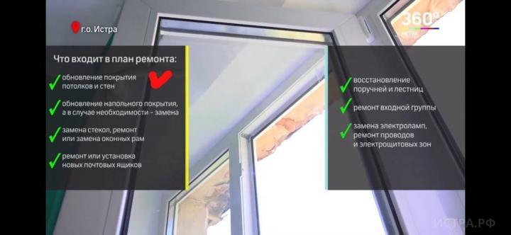В видеозарисовке пресс-службы администрации сообщается, что в городском округе Истра в текущем году будут отремонтированы 100 подъездов. При этом в 10 подъездах работы уже завершены. О ходе ремонта отчитывают ежедневно. Завершить весь запланированный объём работ планируют до 1 августа.