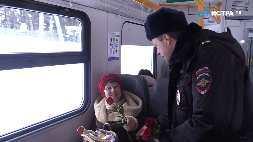 Заместитель начальника линейного отдела полиции на железно-дорожной станции Новоиерусалимская Алексей Панков поздравил женщин от лица транспортной полиции. Роза и светлое пожелание от настоящих мужчин - замечательный сюрприз для пассажирок в преддверии праздника 8 Марта!