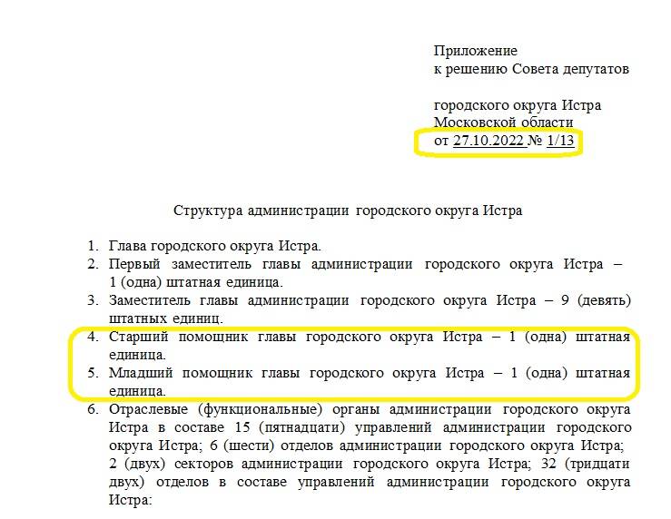 А мы напомним, что структура администрации городского округа Истра, утверждённая решением Совета депутатов городского округа Истра от 27 апреля 2022 года, подразумевает наличие старшего и младшего помощника главы г. о. Истра.