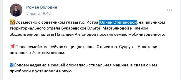 Депутат Московской областной Думы Роман Володин опубликовал пост в соцсети о своём посещении одной из семей мобилизованного в Истре. В гости парламентарий приехал не один. Володин уточнил, что сопровождала его советник главы г. о. Истра Юлия Степанова.