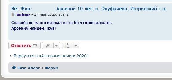 Десятилетний Арсений 27 марта 2020 года вышел из дома в Онуфриево и пропал. Информация о мальчике оперативно появилась на форуме поисково-спасательного отряда «Лиза Алерт».