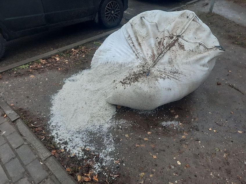 Если с составом и предназначением вещества в мешке всё понятно, то вопрос, почему порванный мешок с солью валяется прямо возле тротуара, вызывает недоумение.