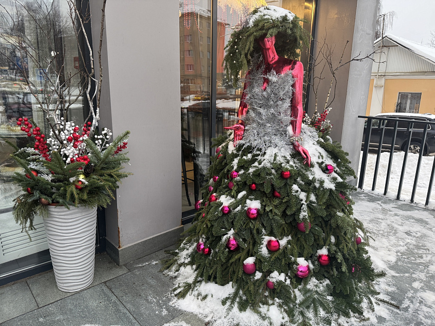 Дама в хвойном облачении привлекает внимание посетителей и создаёт праздничную атмосферу.