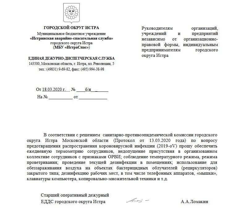 Частично о вышесказанном упоминается и в рассылке, которую получили местные работодатели. В документе говорится, что в соответствии с решением санитарно-противоэпидемической комиссии городского округа Истра Московской области(Протокол от 13.03.2020 года)по вопросу предотвращения распространения коронавирусной инфекции (2019-oV)просьба обеспечить ежедневную термометрию сотрудников, недопущение присутствия в организованном коллективе сотрудников с признаками ОРВИ; соблюдение температурного режима, режима проветривания; проведение текущей дезинфекции в помещениях; использование для обеззараживания воздуха на объектах бактерицидных облучателей (рециркуляторов) закрытого типа; дезинфекцию рабочих мест, в том числе телефонных аппаратов, «мышки», клавиатуры компьютера, копировально-множительной техники и т.д.