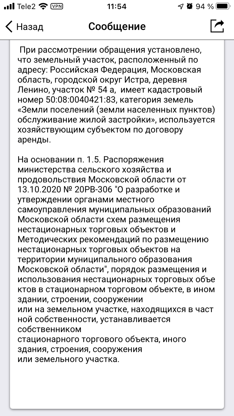 Далее в ответе сообщается: на основании п. 1.5. Распоряжения министерства сельского хозяйства и продовольствия Московской области от 13.10.2020 № 20 РВ-306 «О разработке и утверждении органами местного самоуправления муниципальных образования Московской области схем размещения нестационарных торговых объектов…» порядок размещения и использования нестационарных торговых объектов на земельных участках, находящихся в частной собственности, устанавливается собственником.