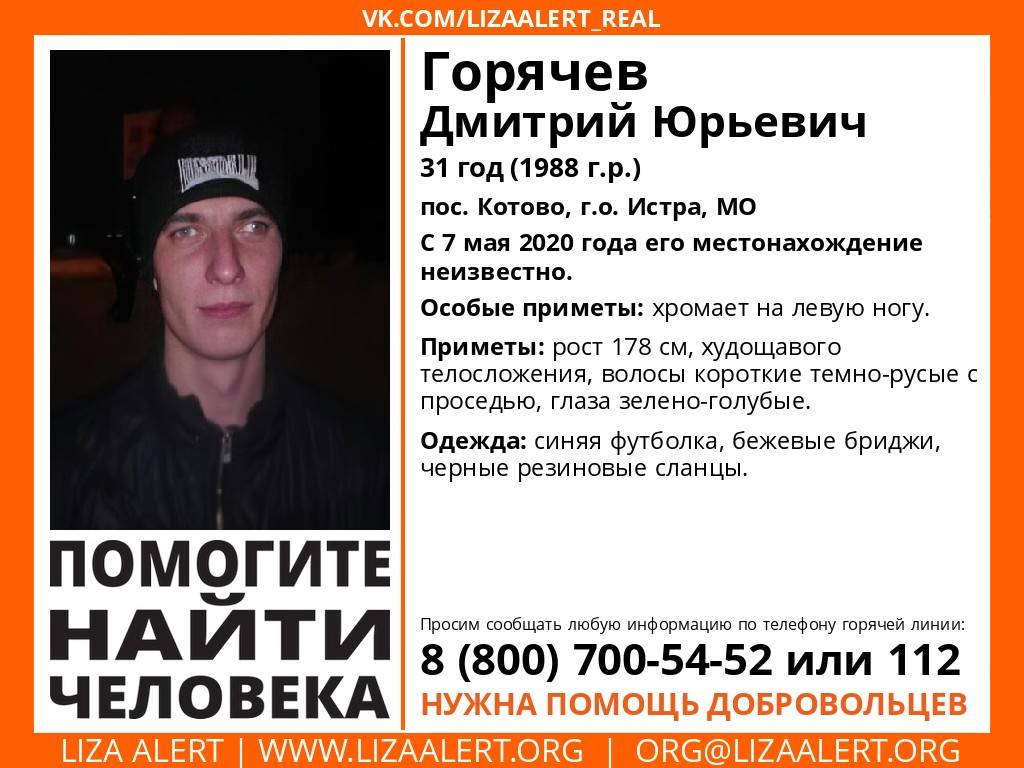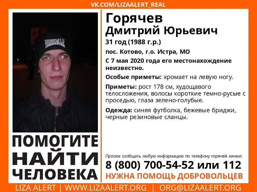 Уточняется, что зовут пропавшего Горячев Дмитрий Юрьевич 31 год, пос. Котово, г.о. Истра. Приметы: Рост: 178 см. Телосложение: худощавое. Цвет глаз: зелено-голубые. Волосы: тёмно-русые, с проседью. Был одет: синяя футболка, бежевые бриджи, черные резиновые сланцы. Особые приметы: Хромает на левую ногу.