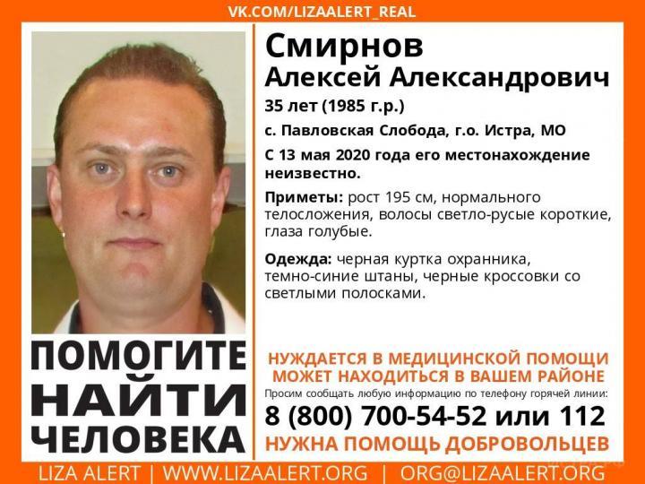 Второй пропавший — Смирнов Алексей Александрович 35 лет, село Павловская Слобода, г.о. Истра. 13 мая 2020 года около 16-00 видели в последний раз, с тех пор местонахождение неизвестно, сообщается на форуме поисковиков. Приметы: рост: 195 см, телосложение: нормальное, цвет глаз: голубые, волосы: светло-русые, короткая стрижка. Был одет: чёрная куртка охранника, тёмно-синие штаны, черные кроссовки со светлыми полосками.
