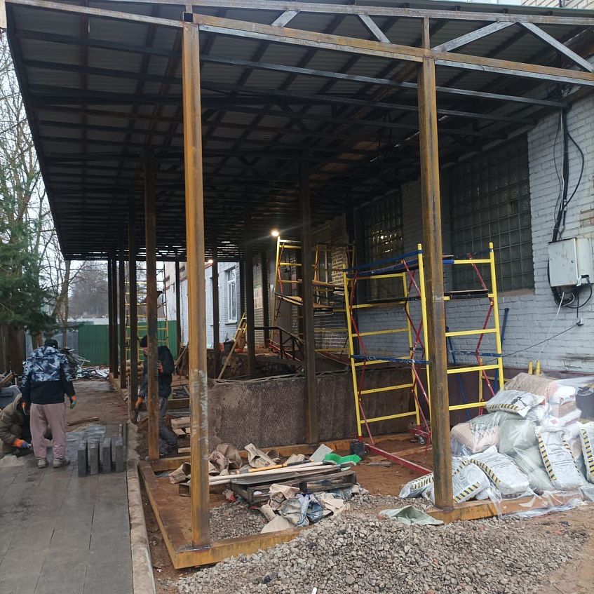 Рабочие произвели заливку площадки бетоном и завершили демонтаж брусчатки, старого крыльца и стоек. Уложена новая гранитная плитка и установлены современные металлоконструкции для навеса.