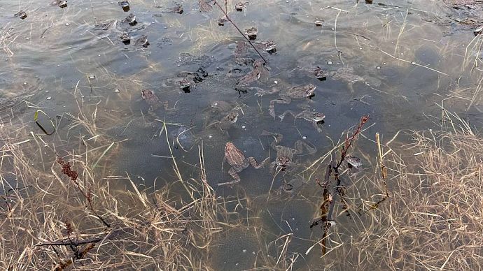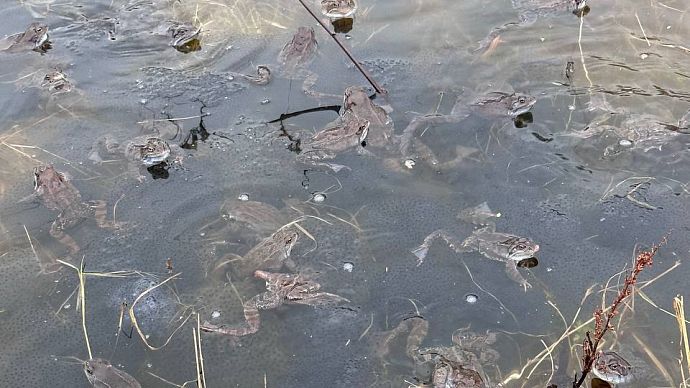 — рассказывают местные жители и публикуют фотографии и видео с водоёмом, тесно набитым плавающими квакушками.