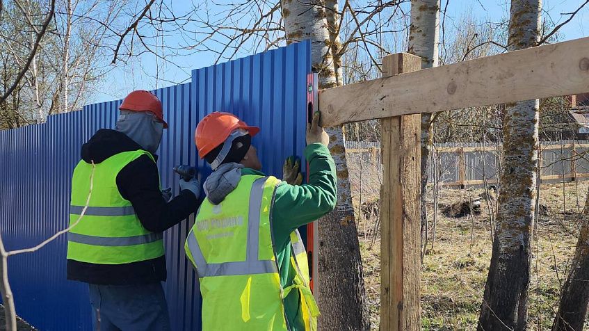 Общая длина ограждения достигнет около 500 метров. Основание забора деревянное, к нему рабочие прикручивают листы синего профнастила.