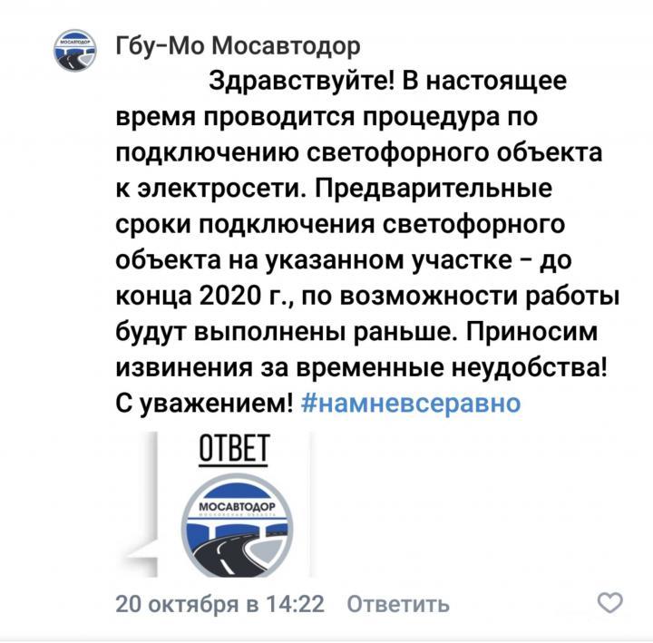 При этом на скорое решение данного вопроса рассчитывать не приходится. По словам заместителя министра транспорта и дорожной инфраструктуры Московской области И.Г. Королёва, строительство данного светофорного объекта является коммерческой стройкой этого года. Включение возможно после принятия СО на баланс, но не позднее чем за 6 месяцев с момента начала данных работ.