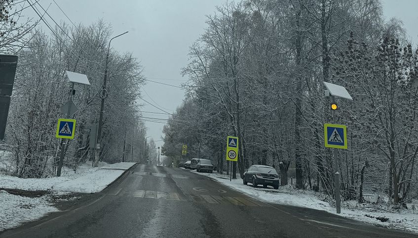 Светофор типа Т-7 с индикацией жёлтого цвета предназначен для привлечения внимания водителей на нерегулируемом переходе в селе Рождествено.