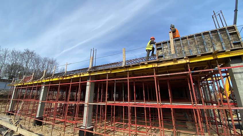 «На площадке рабочие проводят вынос тепловых сетей и водопровода. Одновременно продолжается устройство монолитных конструкций 1,2 этажей здания»», – уточнили в ведомстве.