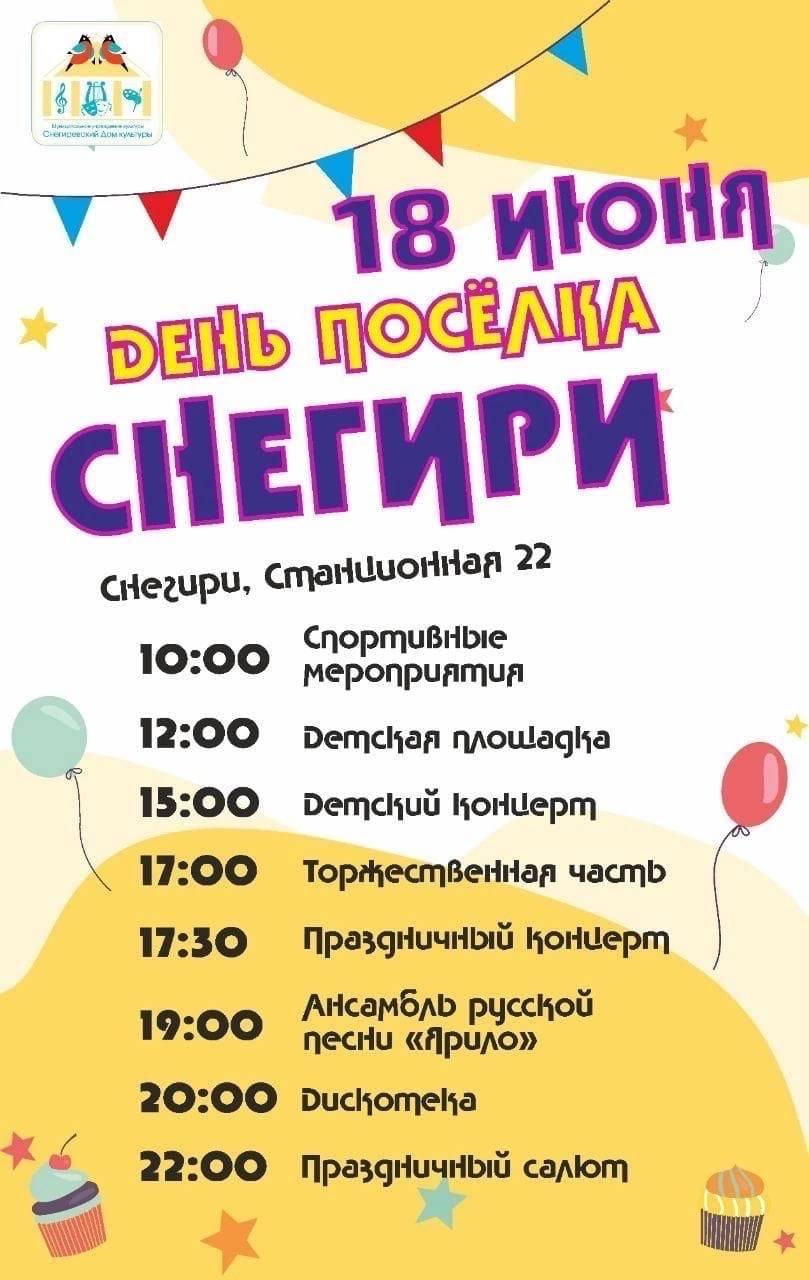Снегирёвцев и гостей приглашают на праздник 18 июня. В программе празднования заявлены концерт, спортивные мероприятия, дискотека и, конечно, же праздничный салют.
