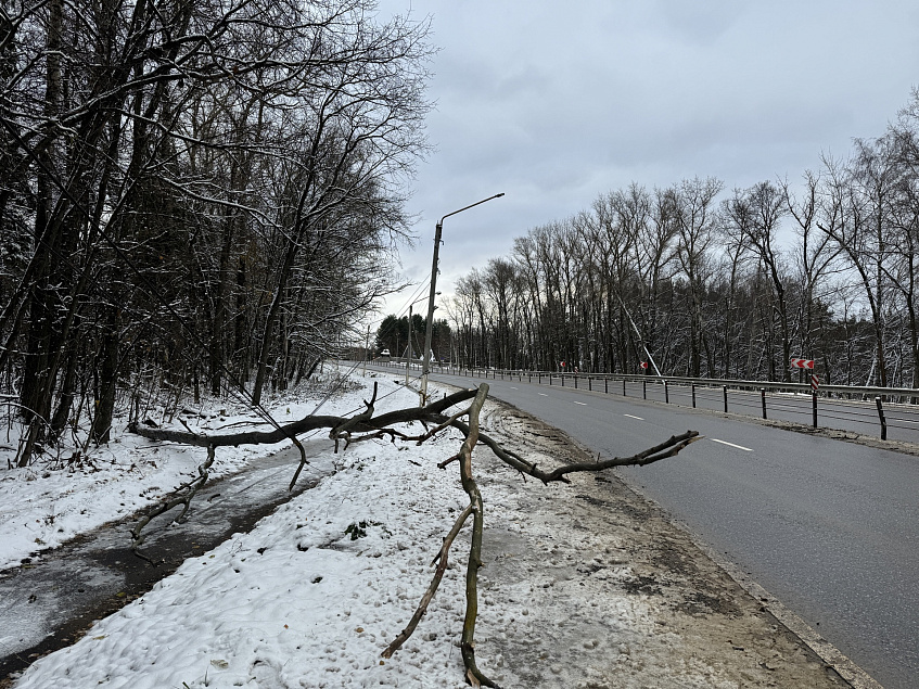 А утром понедельника в деревне Ленино поваленное дерево повисло на проводах линии уличного освещения и перекрыло пешеходную дорожку вдоль Волоколамского шоссе.