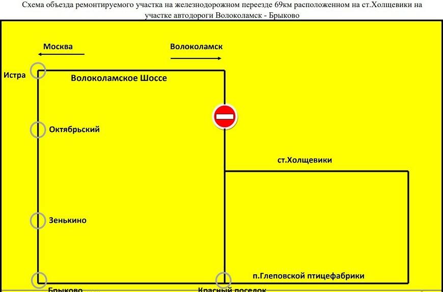 С 15 июня с 20.00 до 16 июня до 06.00 и с 16 июня с 20.00 до 17 июня до 06.00 будет перекрыт железнодорожный переезд 69-й км, расположенный вблизи станции Холщевики на участке автодороги Волоколамск - Брыково Рижского направления.