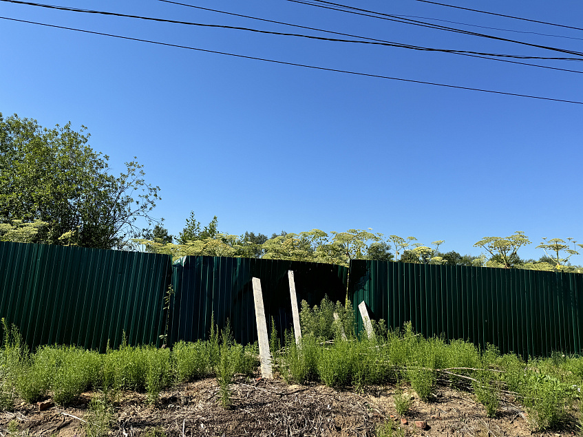 В результате спустя три года оказался построен только забор. В настоящее время он покосился, а территория за ним заросла борщевиком, который достиг такой высоты, что виден над ограждением.