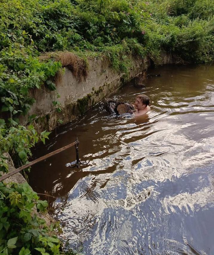 Когда попытка ликвидировать завал баграми с берега не увенчалась успехом, пришлось прибегнуть к водным процедурам. Один из сотрудников добрался до завала и разобрал его вручную.