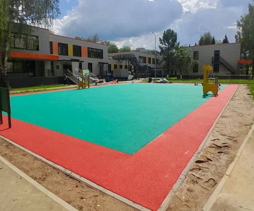 Сегодня на объекте задействовано 8 квалифицированных специалистов, которые ежедневно выполняют необходимый объём работ. Рабочие приступили к высадке можжевельника (выполнено 40 %), планировке газона (выполнено 50 %) и монтажу резинового покрытия (выполнено 65 %).