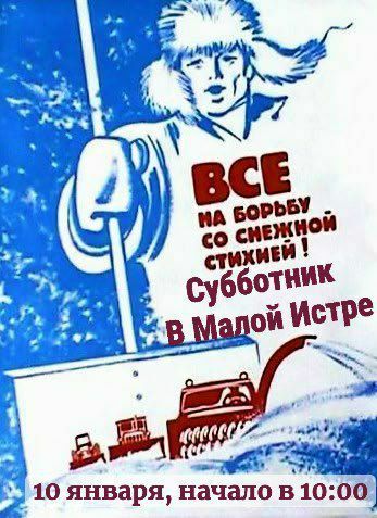Принять участие в расчистке микрорайона от снега пригласили жителей Малой Истры. Субботник состоится 10 января в 10:00. В объявлении также сообщается, что получить уборочный инвентарь можно в УК (вход в подвал у 4 подъезда 2 дома).