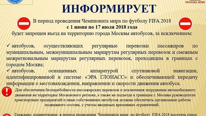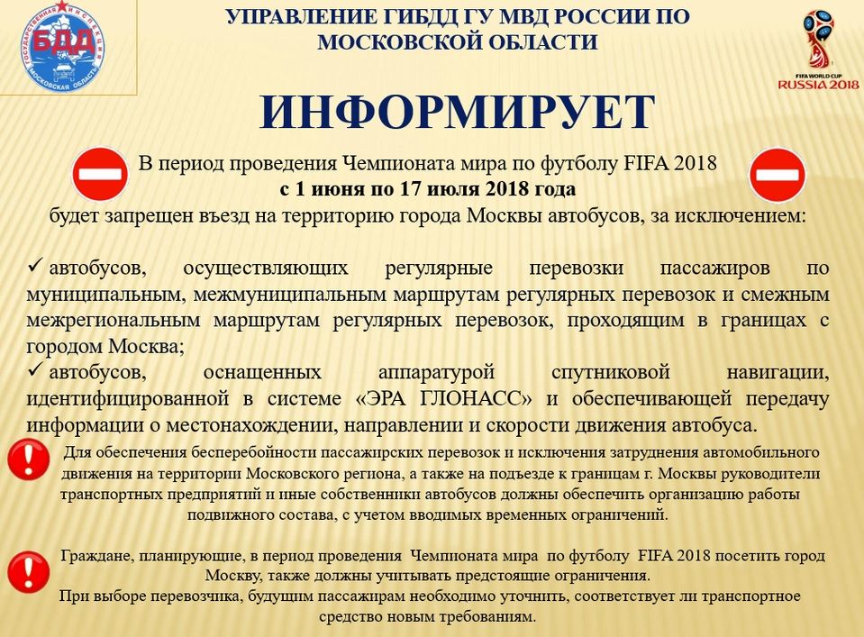 Во избежание затруднений дорожного движения на территории Московской области при подъезде к границам г. Москвы, а также срыва пассажирских перевозок в указанный период, необходимо учитывать вышеуказанные требования и принять необходимые меры для беспрепятственного проезда по маршрутам движения в г. Москве.
