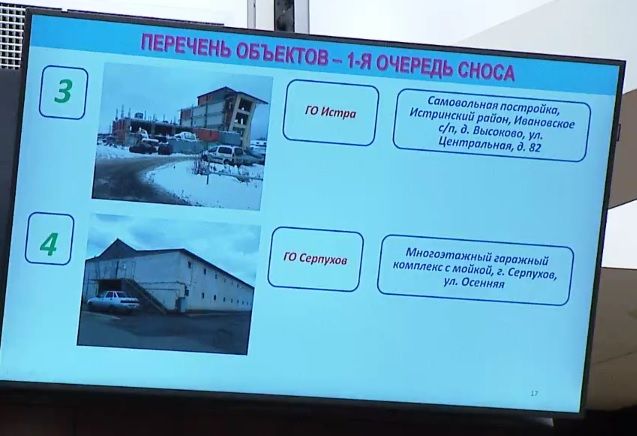 В перечень объектов первой очереди сноса, работы по которым должны осуществиться в 2018 году, попали и истринские долгострои. В частности, речь идет об объекте, расположенном в д. Ленино, и о самовольной постройке в д. Высоково на ул.Центральная. Дорожные карты по ликвидации самовольных построек должны быть готовы в срок до 20 марта текущего года. Сам же отчёт о ходе работ должен быть предоставлен до 1 июня 2018 года.
