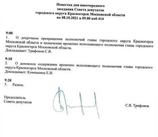 По данным издания РИАМО, внеочередное заседание Совета депутатов Красногорского округа состоялось в администрации муниципалитета сегодня. Вёл заседание председатель Совета Сергей Трифонов. Первым вопросом повестки дня стал о досрочном прекращении полномочий главы муниципалитета и назначении временно исполняющего полномочия главы муниципалитета.