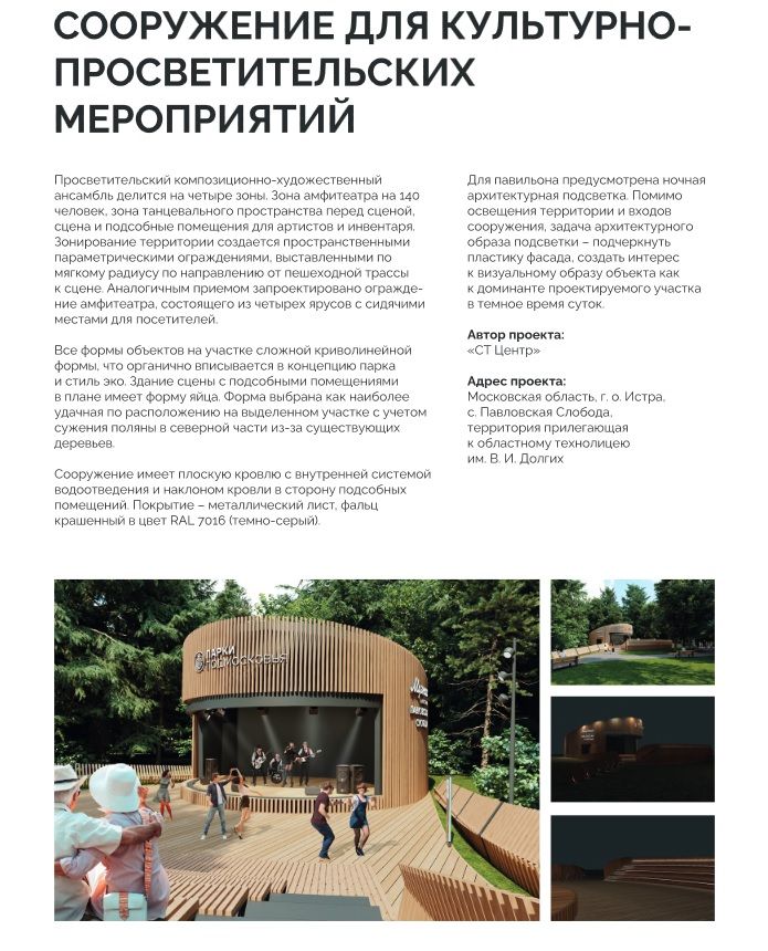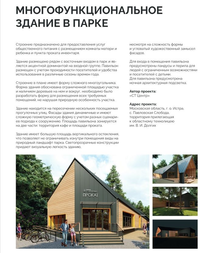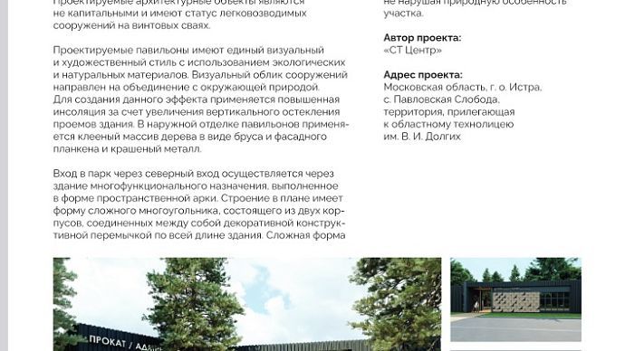 Отдельно в данном каталоге представлены также: административное здание парка, многофункциональное здание и сооружение для культурно-просветительских мероприятий.