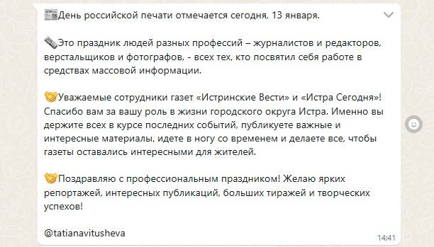 Глава городского округа Татьяна Витушева поздравила на своей страничке в Телеграм-канале сотрудников газет «Истра сегодня» и «Истринские вести» с профессиональным праздником.
