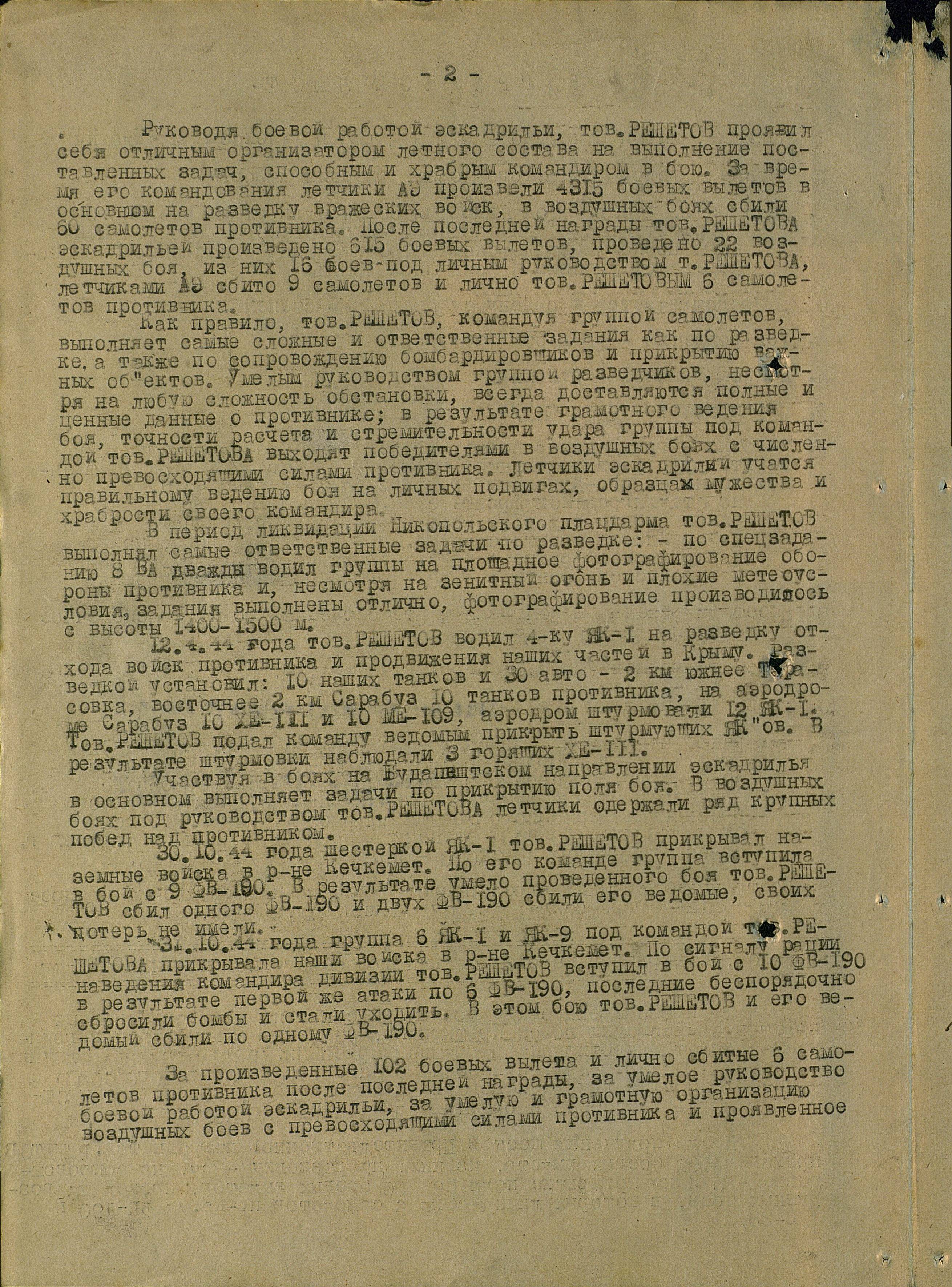 "В Венгрии, в районе Эстергома, Решетов прикрывал с однополчанами переправу. Летали шестёрки. Только принял эту переправу от дежурившей шестёрки, забеспокоился: идут "Фокке-Вульфы". Ого, 48 машин! Соотношение не очень весёлое — один к восьми.