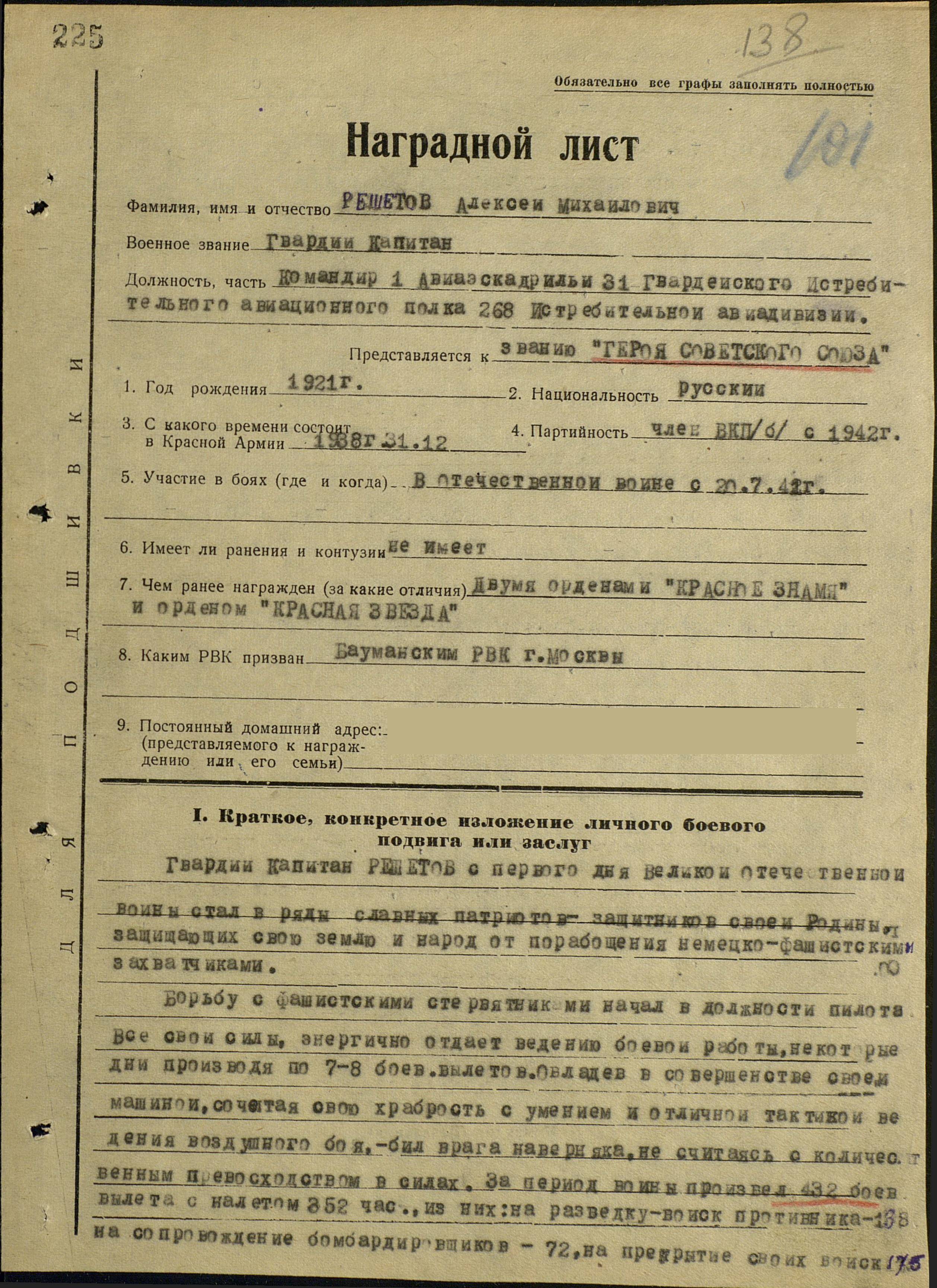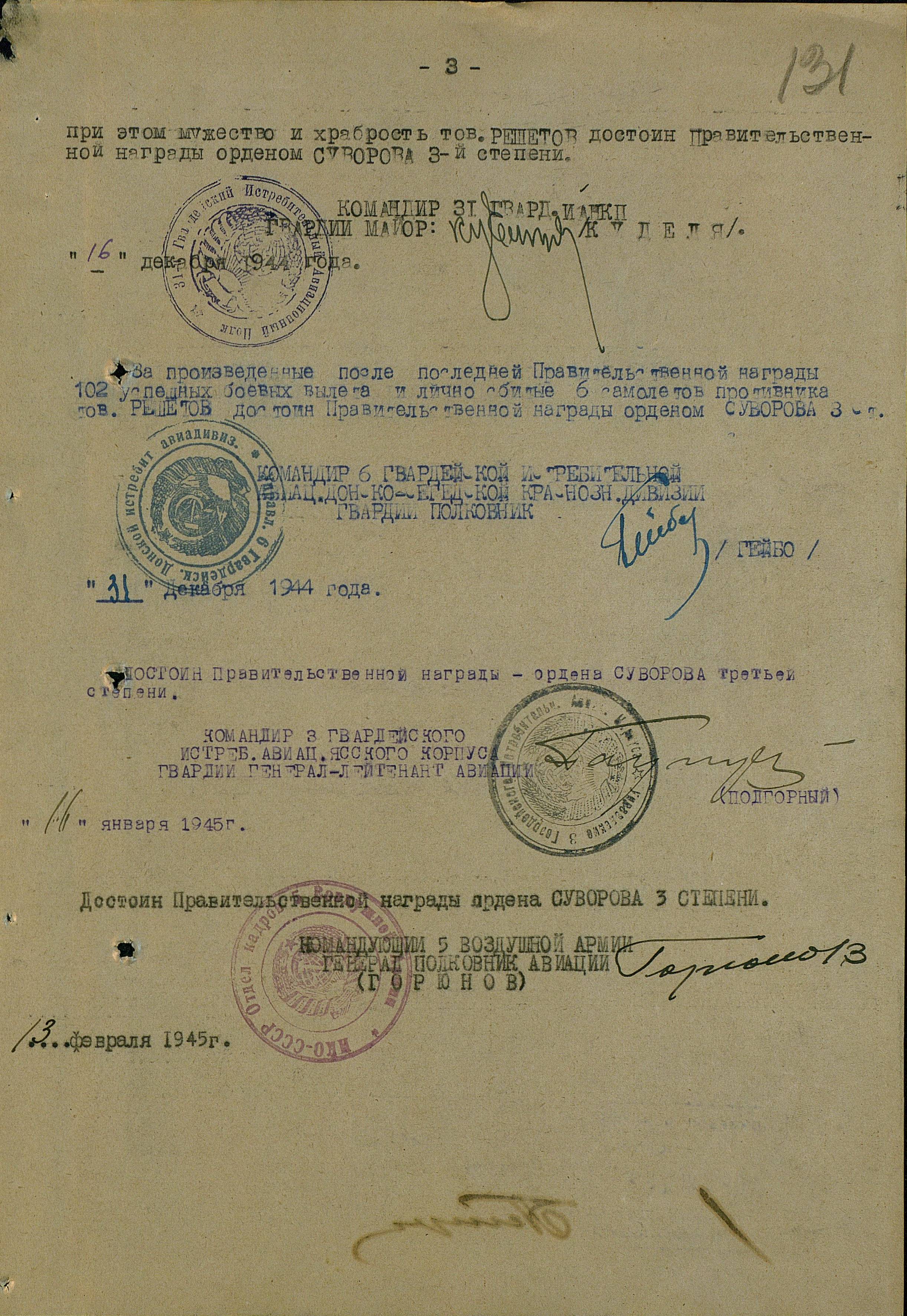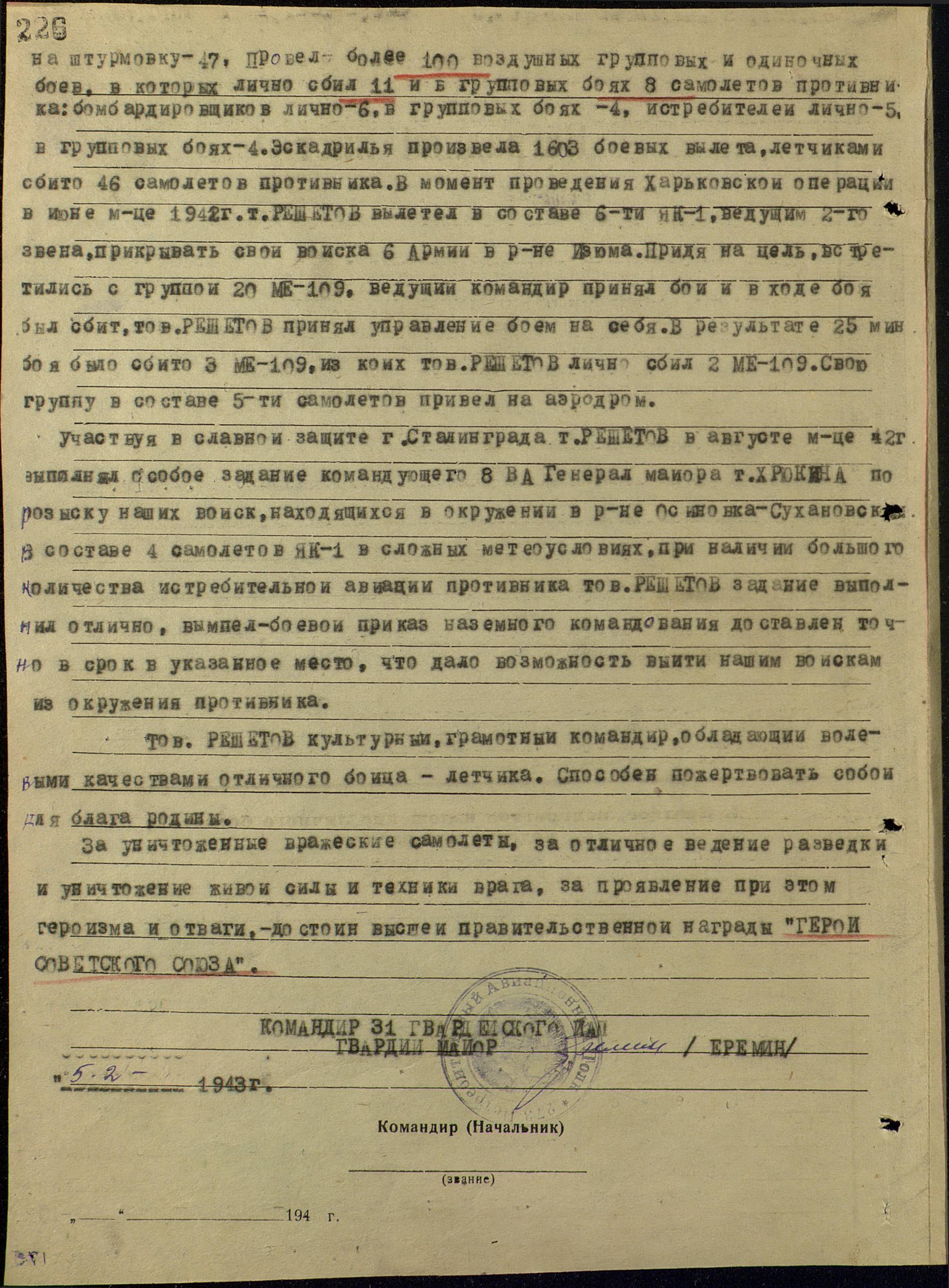 5 февраля 1943 года командир 31-го истребительного авиационного полка представил на командира эскадрильи капитана Решетова наградный лист, в котором были такие слова: "Товарищ Решетов — культурный, грамотный командир, обладающий волевыми качествами отличного бойца-лётчика. Способен пожертвовать собой для блага Родины. За уничтожение вражеских самолётов, за отличное ведение разведки и уничтожение живой силы и техники врага, проявленные при этом героизм и отвагу достоин высшей правительственной награды — звания Героя Советского Союза".