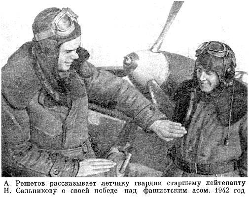 Как командир группы, решил атаковать ведущего. Не сразу, не так быстро, как хотелось, но одолел его. Костыгин, ведущий звена, вскоре сбил второго. Наши распалились: наседают дерзко. Немцы вынуждены пикировать. Бомбовый груз сбрасывают невпопад. Бой ещё не кончился, а Решетов получил радиограмму: все летчики его группы награждаются орденами, сам он — орденом Суворова. Шестёрка потерь не понесла, переправу защитила, сожгла восемь "Фокке-Вульфов".