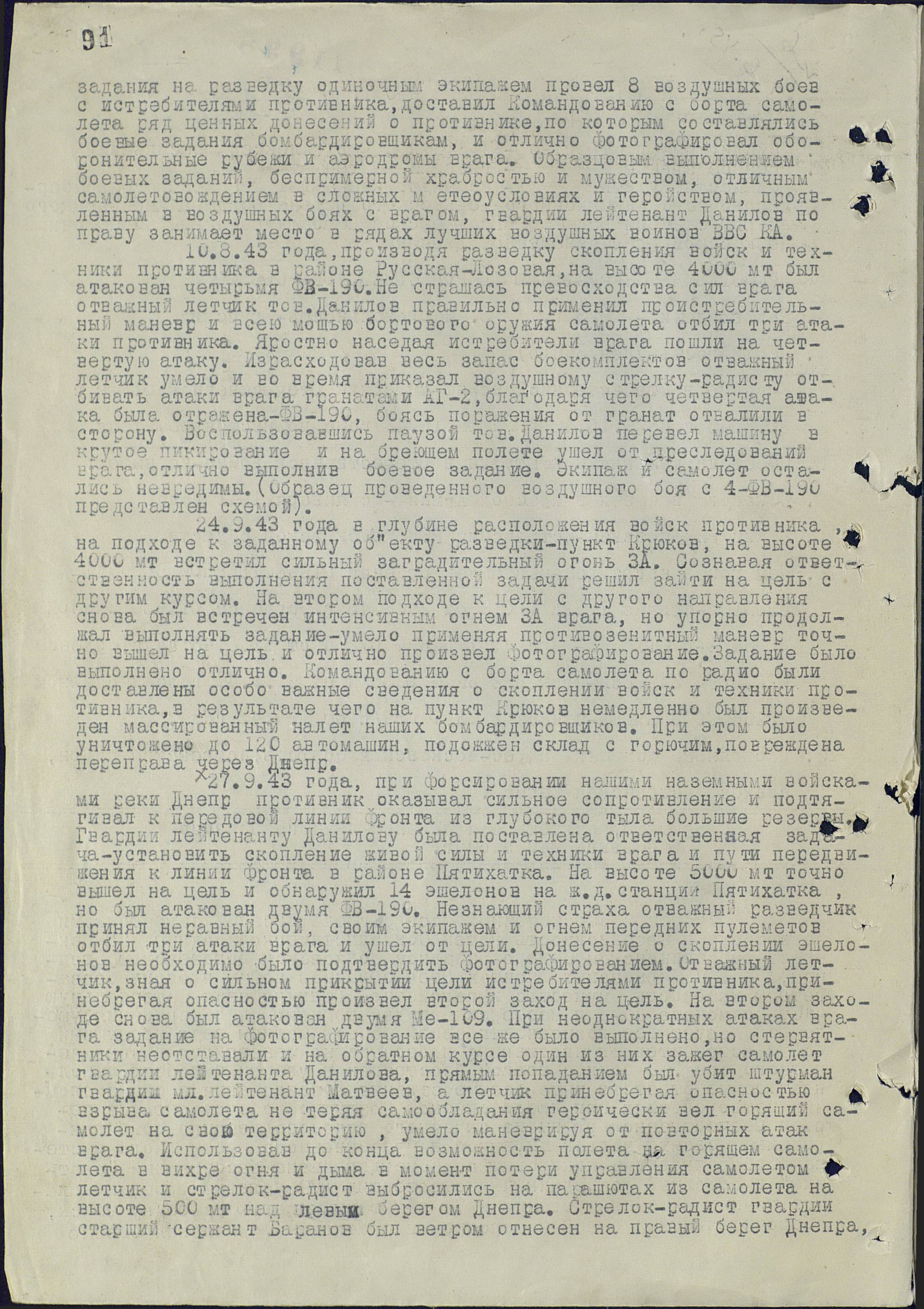 Именно такой случай произошёл с ним 27 сентября 1943 года. Наши наземные силы форсировали Днепр. Противник оказывал яростное сопротивление, подтягивал к переправе свежие силы. Гвардии лейтенант Данилов получил приказ установить скопление живой силы и техники врага, пути продвижения к фронту.