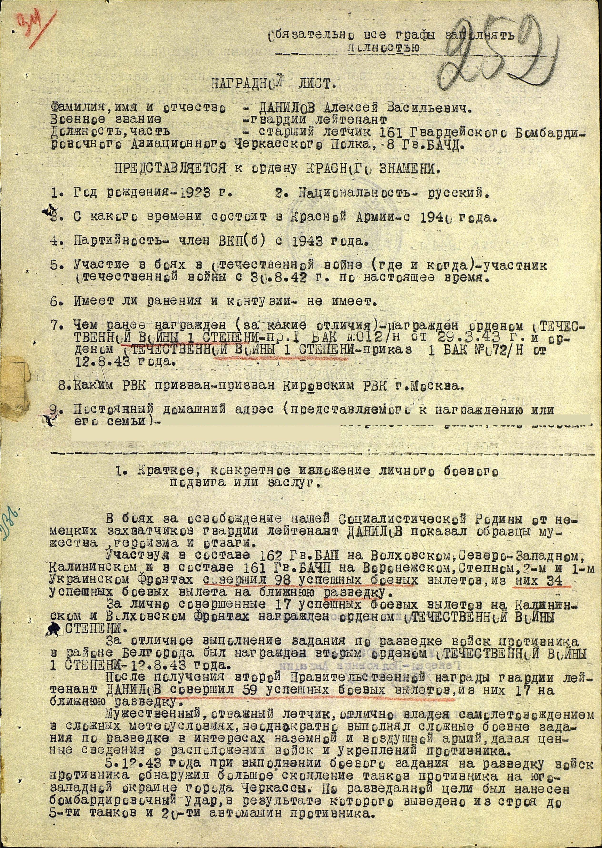 За войну совершил 179 успешных боевых вылетов. Из них 82 — на бомбёжку с пикирования. За героизм, мужество и отвагу 27 июня 1945 года Алексею Данилову было присвоено звание Героя Советского Союза.