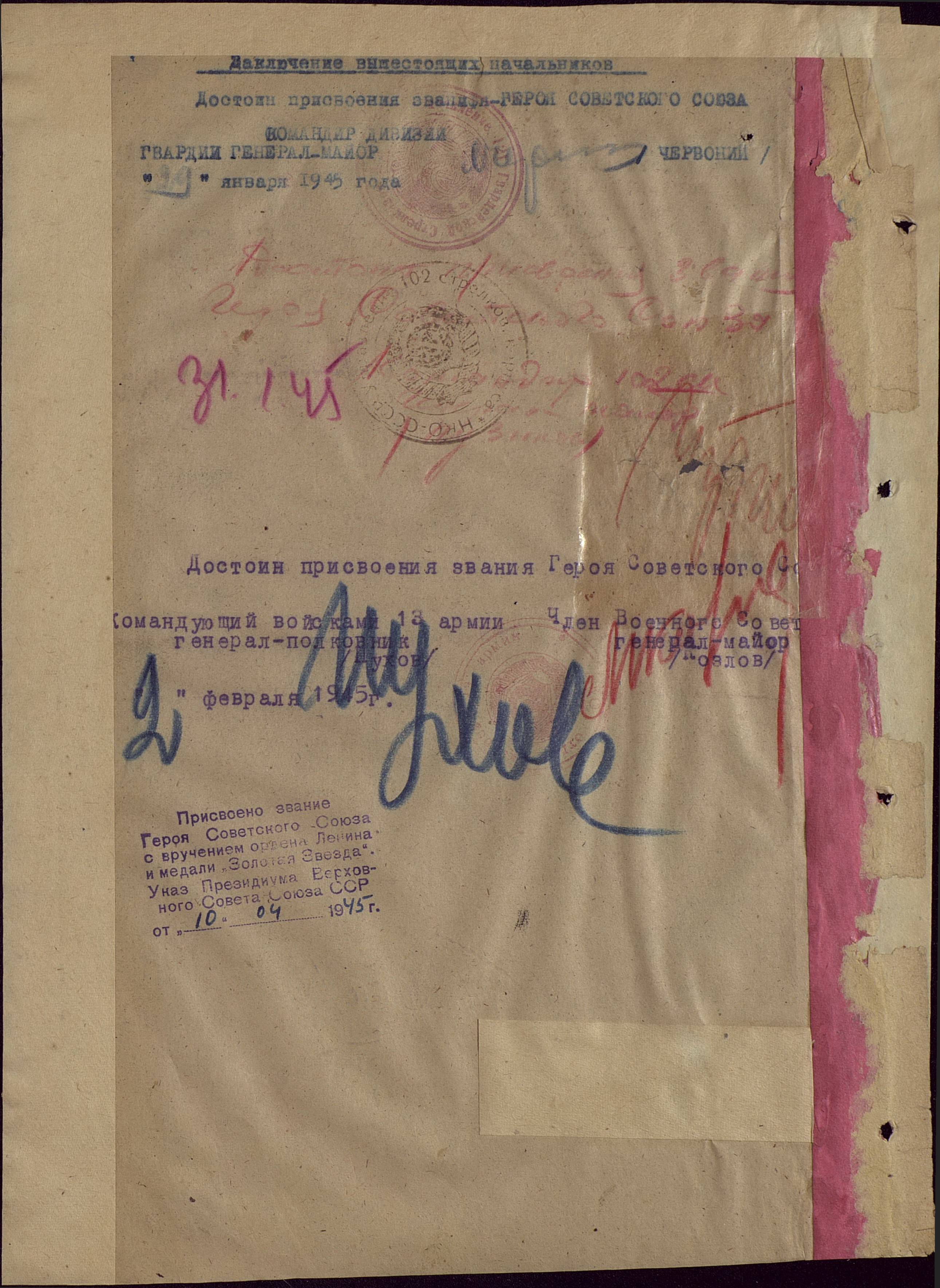 За Ваш геройский подвиг, проявленный при выполнении боевых заданий командования на фронте борьбы с немецкими захватчиками Президиум Верховного Совета СССР своим Указом от 10 апреля 1945 года присвоил Вам звание Героя Советского Союза.