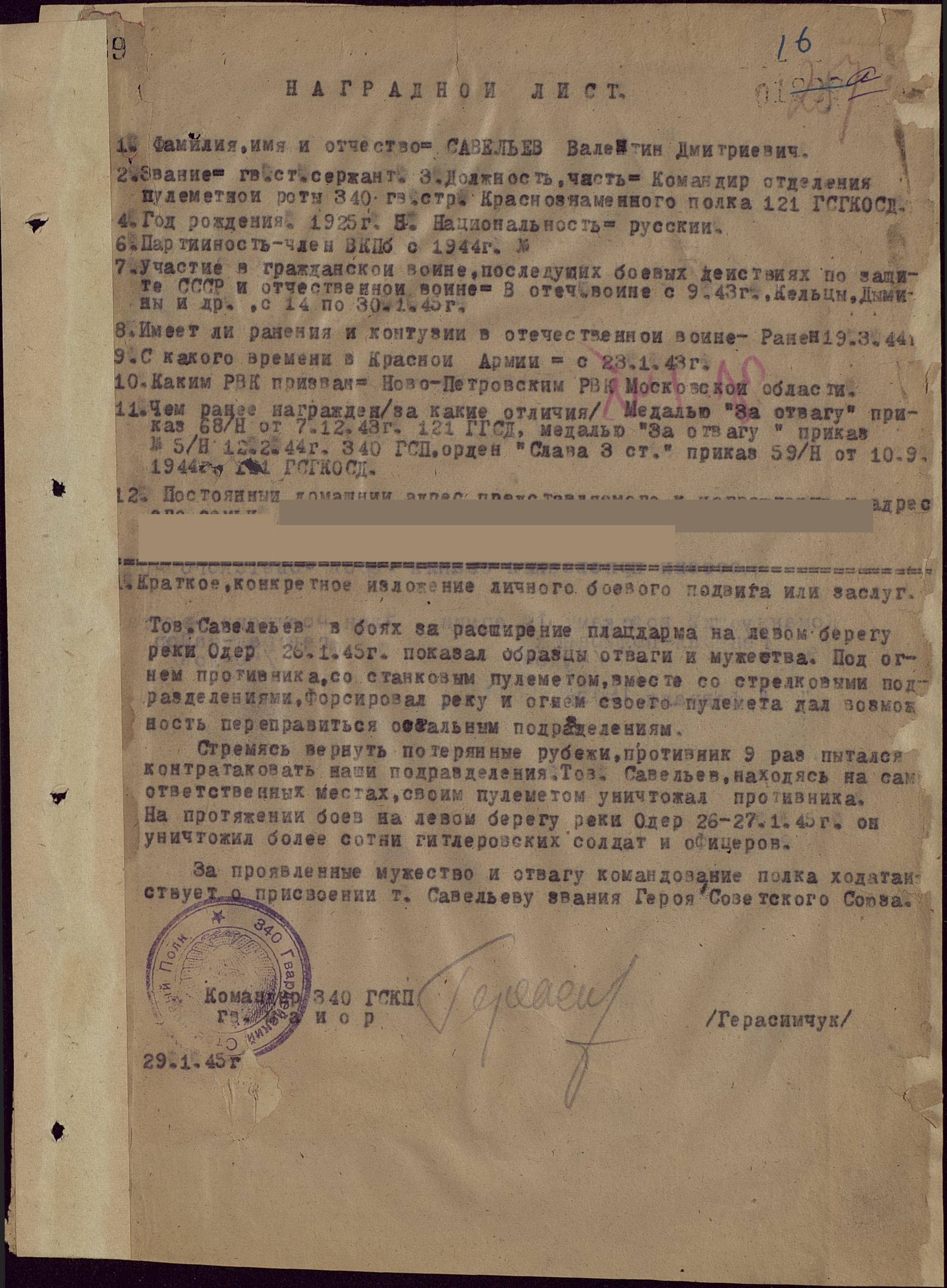 С одерского плацдарма дивизия с боями пошла вперёд. Вместе с гвардейцами полка шёл и Валентин Савельев. Но он тогда ещё не знал, что, спустя всего два дня после гитлеровских контратак, 29 января, на него по цепочке вверх уже ушли документы на звание Героя.