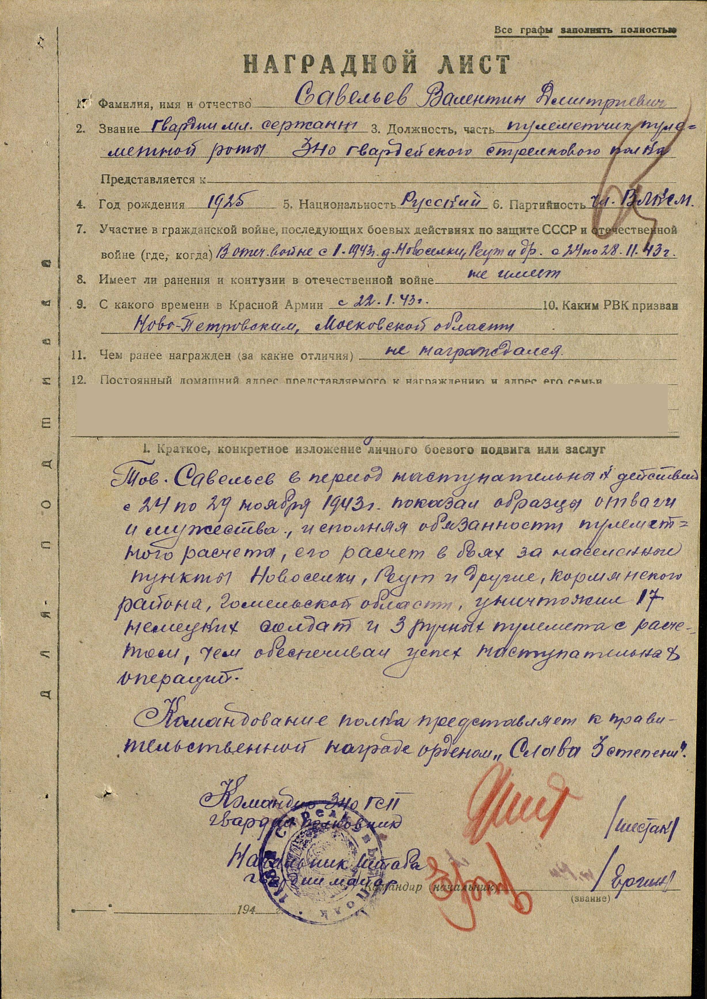"Герою Советского Союза товарищу Савельеву Валентину Дмитриевичу