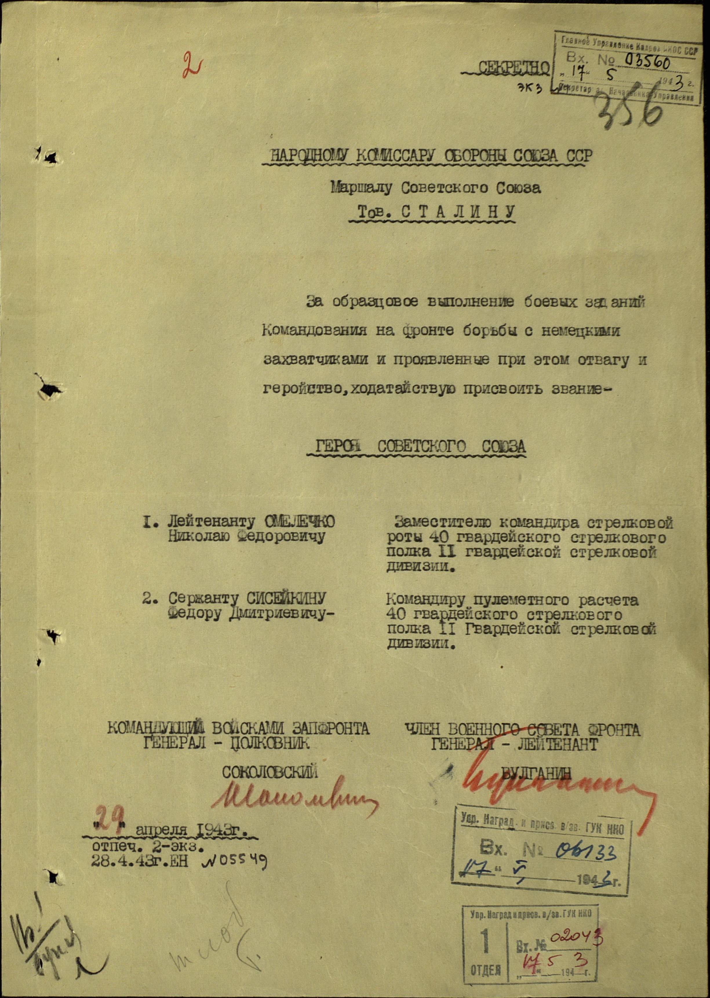 Отважного пулемётчика из медсанбата, оказав ему неотложную помощь, отправили в тыловой госпиталь. Там он и узнал, что Указом Президиума Верховного Совета СССР от 19 июня 1943 года ему было присвоено звание Героя Советского Союза.
