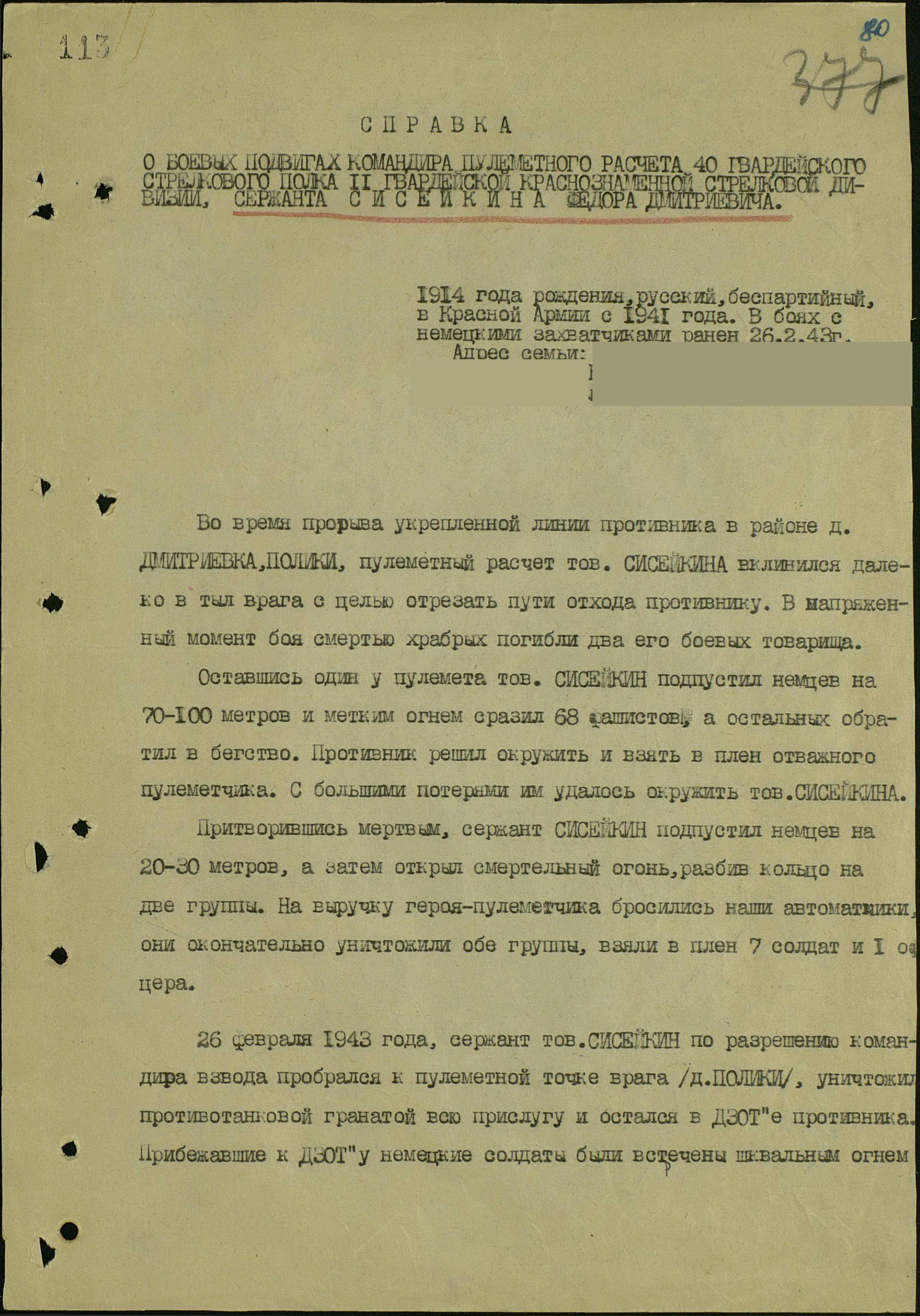 Помощь очень кстати подоспела. Но Сисейкин лежал уже без сознания, уткнувшись окровавленным телом в продырявленный кожух пулемёта. Вокруг валялись вражьи трупы... 68 трупов.