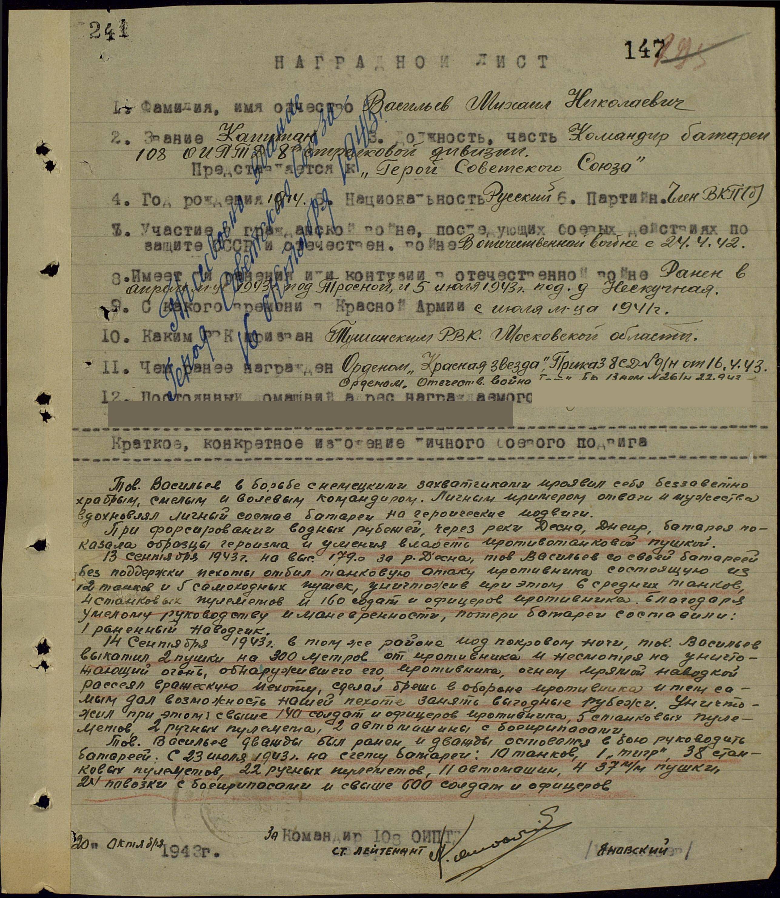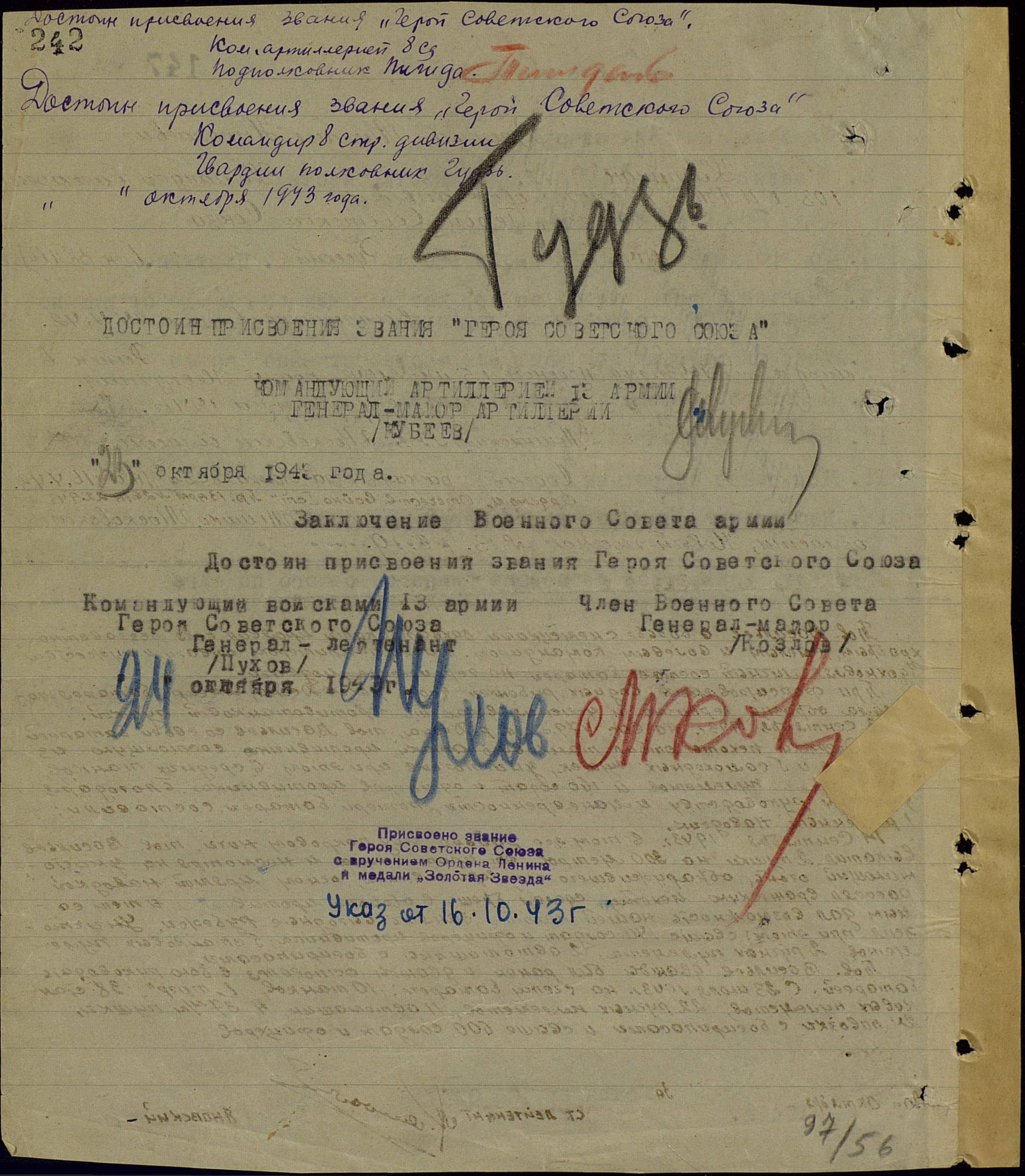 Звания Героя Советского Союза удостоен 16 октября 1943 года.