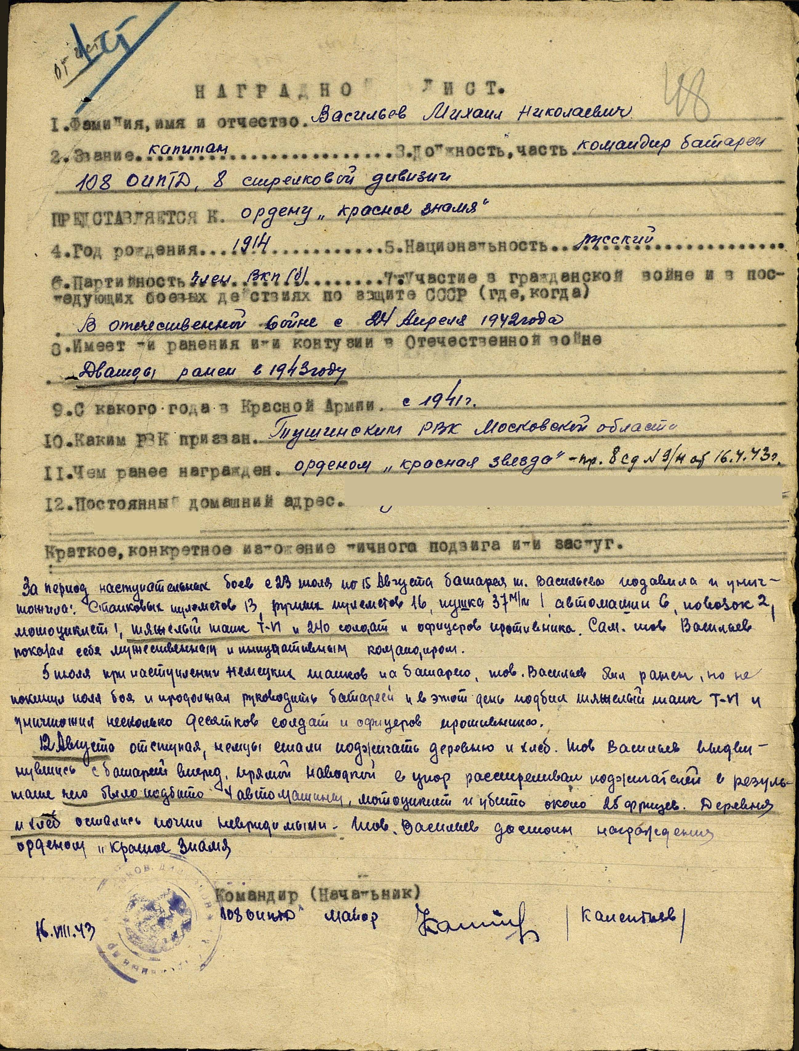 В конце апреля сорок второго Васильев прибыл на фронт. Попал в 108-й отдельный истребительный противотанковый дивизион 8-й стрелковой дивизии. Сначала фронтовая жизнь щадила его. Только потом уже, в сорок третьем, пришлось опробовать лиха без нормы. В апреле под Тросной его ранило. Через два с небольшим месяца ранило ещё раз. Но он и раненый оставался в строю.