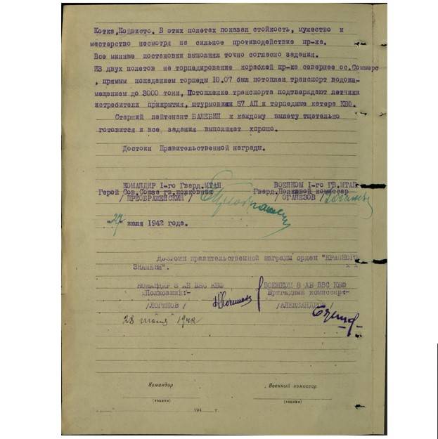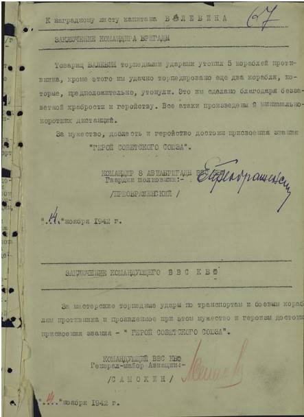Командующий военно-воздушными силами Краснознаменного Балтийского Флота генерал-майор авиации Самохин: "За мастерские удары по транспортам и боевым кораблям противника и проявленные при этом мужество и героизм достоин присвоения звания "Герой Советского Союза".