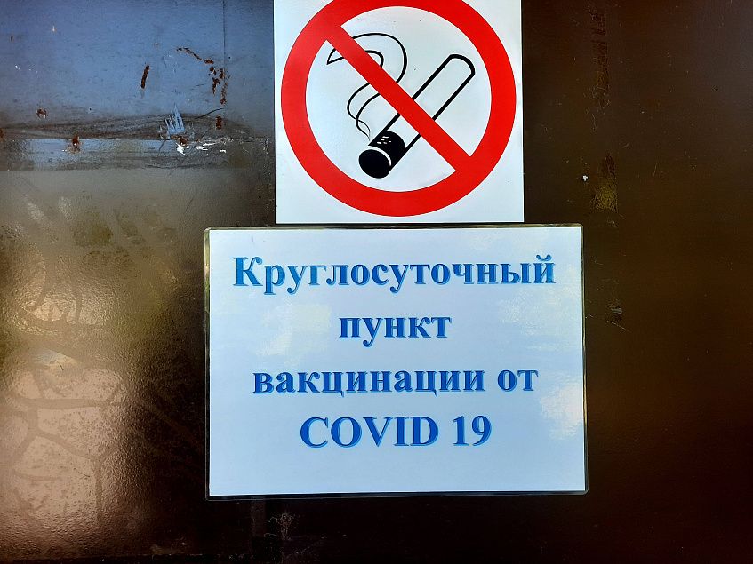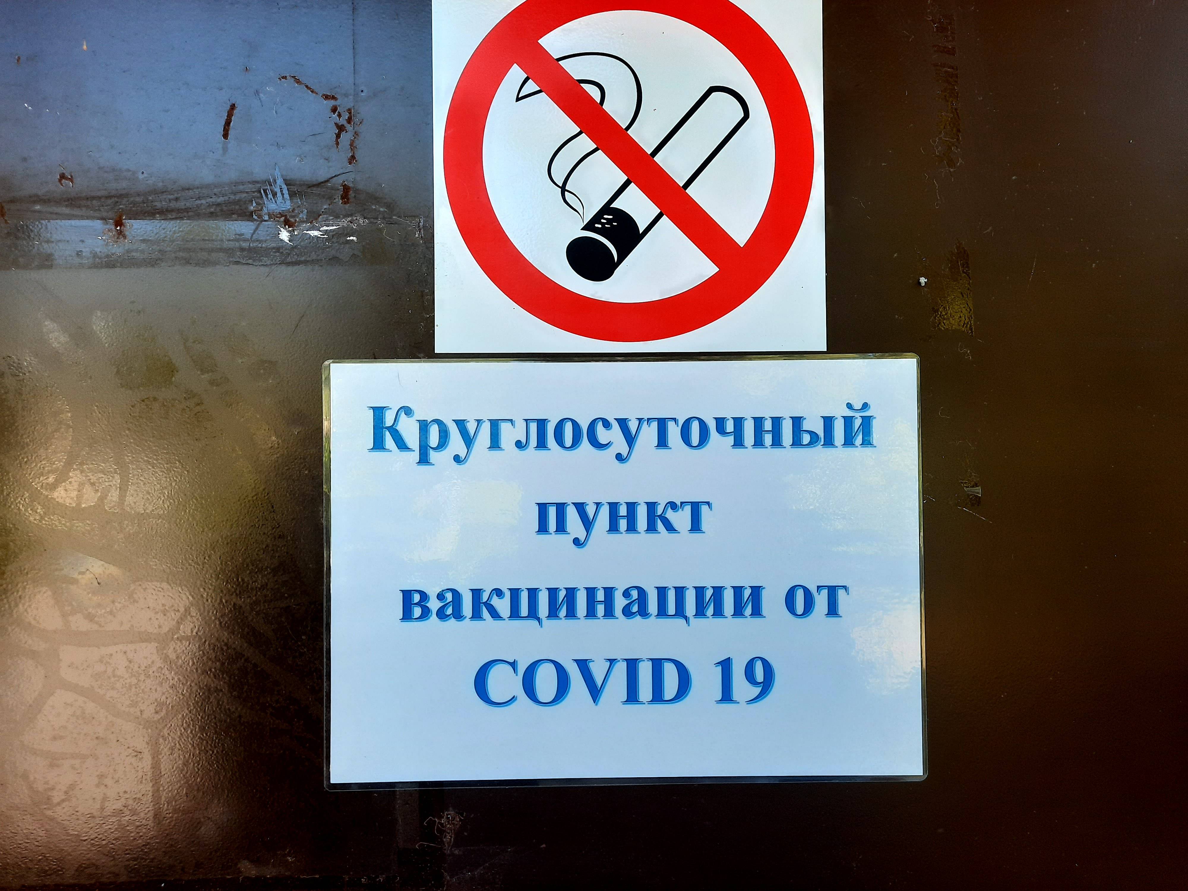 Сейчас на дверях прививочного кабинета в круглосуточном пункте вакцинации от COVID-19 повесили объявление, что на вторую дозу вакцины надо записываться тоже в поликлинике.