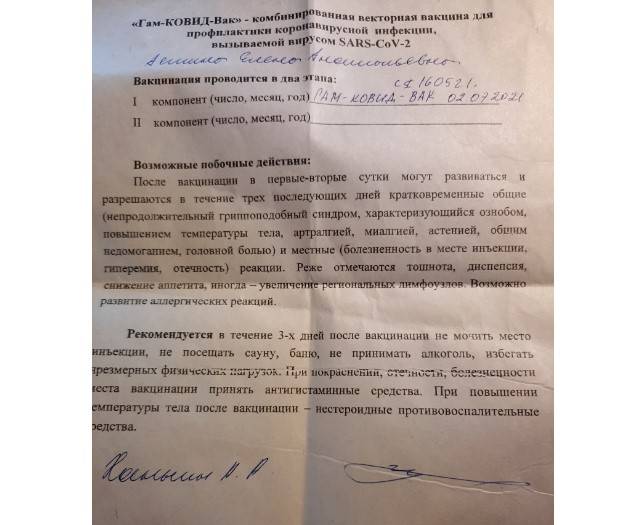 Есть ещё третий лист, тоже формата А4. В нём указано, какую именно вакцину вам введут и для чего. Описаны возможные побочные эффекты и разъяснено, что нужно и что не нужно делать после вакцинации. Вот на этом самом бланке вам надо написать только дату введения первого компонента вакцины, т.е число, месяц и год, когда вы пришли на первую прививку. На этом же бланке доктор напишет, когда вам нужно прийти и получить второй компонент вакцины, и поставит свою подпись — если вы, конечно не сбежите, а всё-таки зайдёте и сделаете первый укол.